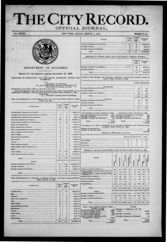 The City Record newspaper publishes notices which includes but is not limited to: public hearings and meetings, public auctions and sales, solicitations and awards and official rules proposed and adopted by city agencies. This is the City Record Newspaper for March 09, 1900.