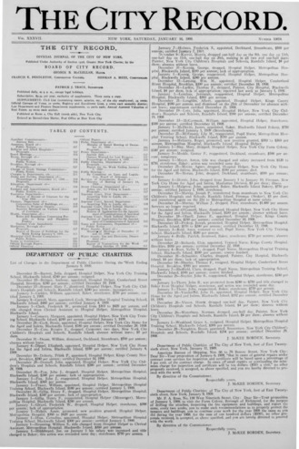 The City Record newspaper publishes notices which includes but is not limited to: public hearings and meetings, public auctions and sales, solicitations and awards and official rules proposed and adopted by city agencies. This is the City Record Newspaper for January 16, 1909.