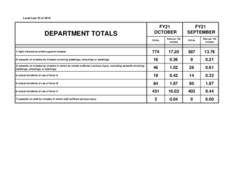 Pursuant to local law 33 of 2016, this report provides information on security indicators in city jails, including uses of force, assaults on staff and/or people in custody, and violent incidents