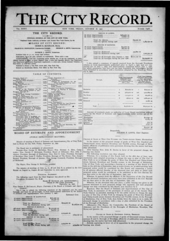 The City Record newspaper publishes notices which includes but is not limited to: public hearings and meetings, public auctions and sales, solicitations and awards and official rules proposed and adopted by city agencies. This is the City Record Newspaper for October 18, 1907.