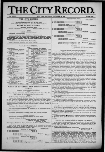 The City Record newspaper publishes notices which includes but is not limited to: public hearings and meetings, public auctions and sales, solicitations and awards and official rules proposed and adopted by city agencies. This is the City Record Newspaper for December 29, 1906.