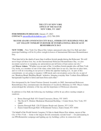 New York City Mayor Eric Adams announces that City Hall and other municipal buildings will be lit yellow in honor of International Holocaust Remembrance Day.
