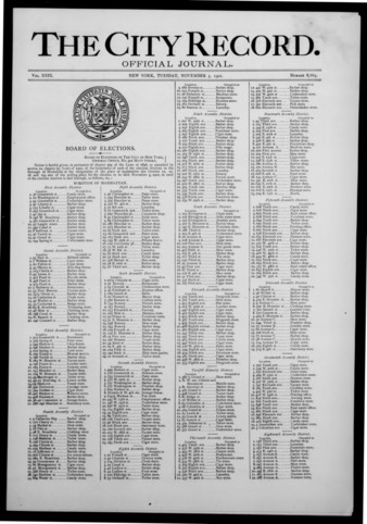 The City Record newspaper publishes notices which includes but is not limited to: public hearings and meetings, public auctions and sales, solicitations and awards and official rules proposed and adopted by city agencies. This is the City Record Newspaper for November 05, 1901.