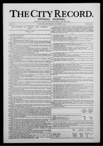 The City Record newspaper publishes notices which includes but is not limited to: public hearings and meetings, public auctions and sales, solicitations and awards and official rules proposed and adopted by city agencies. This is the City Record Newspaper for December 03, 1902.