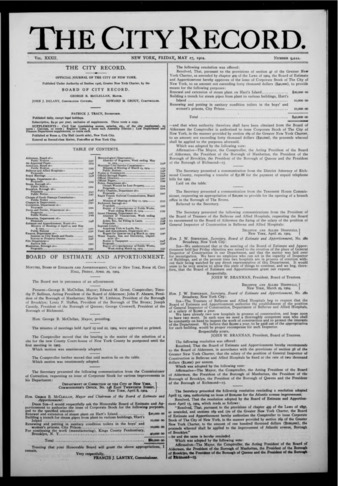 The City Record newspaper publishes notices which includes but is not limited to: public hearings and meetings, public auctions and sales, solicitations and awards and official rules proposed and adopted by city agencies. This is the City Record Newspaper for May 27, 1904.