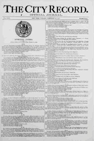 The City Record newspaper publishes notices which includes but is not limited to: public hearings and meetings, public auctions and sales, solicitations and awards and official rules proposed and adopted by city agencies. This is the City Record Newspaper for February 26, 1901.