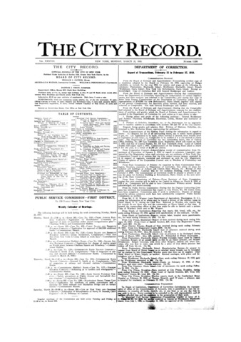 The City Record newspaper publishes notices which includes but is not limited to: public hearings and meetings, public auctions and sales, solicitations and awards and official rules proposed and adopted by city agencies. This is the City Record Newspaper for March 21, 1910.