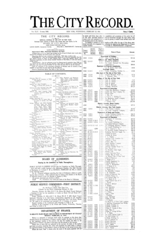 The City Record newspaper publishes notices which includes but is not limited to: public hearings and meetings, public auctions and sales, solicitations and awards and official rules proposed and adopted by city agencies. This is the City Record Newspaper for February 23, 1916.