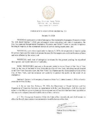 Emergency Executive Order No. 2.1 dated January 10, 2026, is being submitted as it is related to the state of emergency on how the City has operated Humanitarian Emergency Response and Relief Centers, shall take effect immediately and remain in effect for five (5) days.