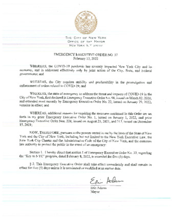 Emergency Executive Order 37 extends Emergency Executive Order 33, dated February 8, 2022 by 5 days. It relates to the Key to NYC program and the City's response to the COVID-19 pandemic.