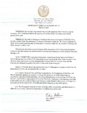 Emergency Executive Order No. 53 extends sections 2(b) and 3 of Emergency Executive Order No. 50, dated March 4, 2022, for 5 days. It relates to the City's response to the COVID 19 pandemic.