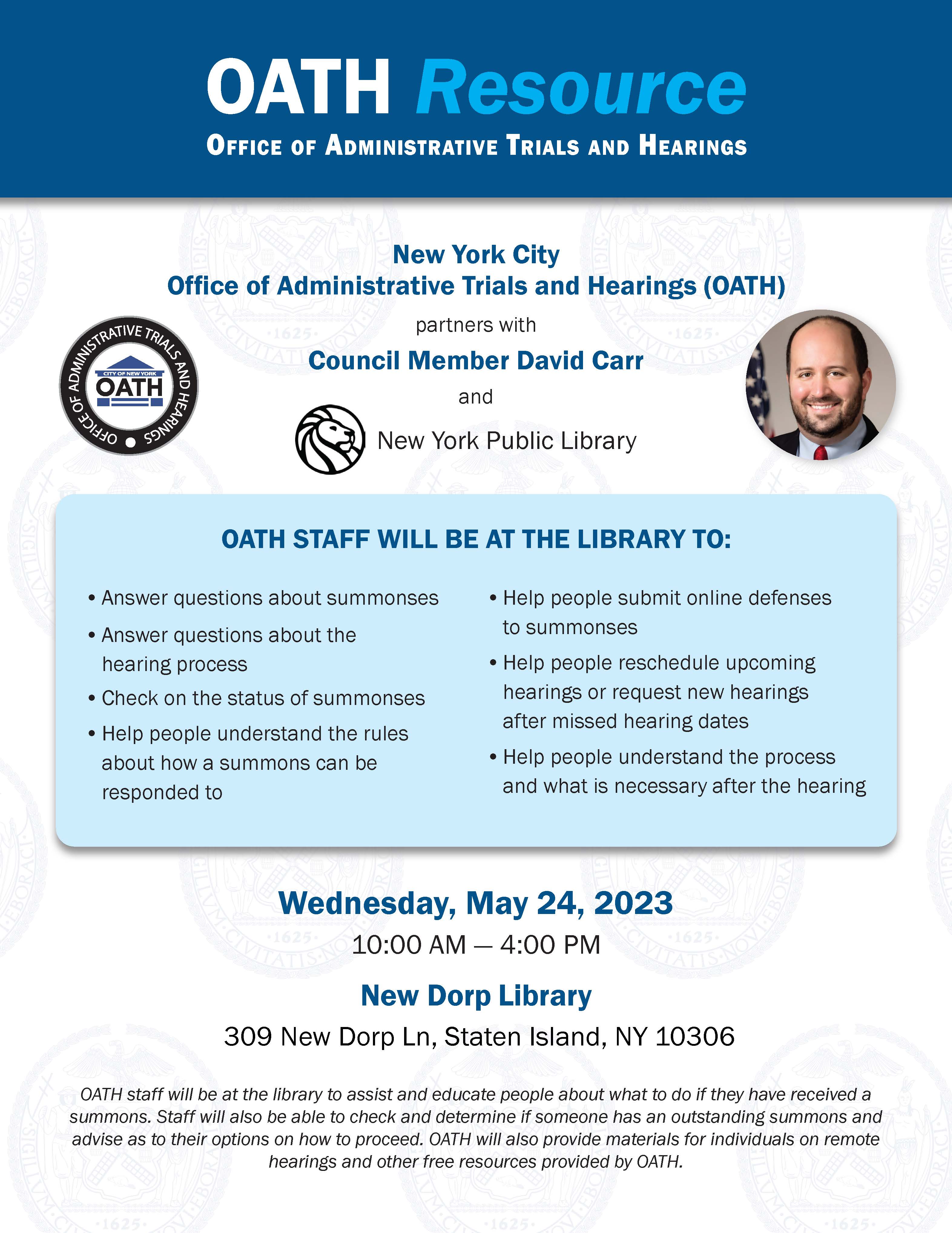 OATH staff were at the library to assist and educate people about what to do should they have received a summons and to check to determine if someone has an outstanding summons. Materials about remote hearings and other free resources were provided to the public as well.
