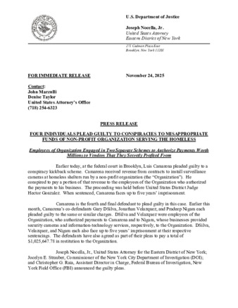 Earlier today, at the federal court in Brooklyn, Luis Camarena pleaded guilty to a conspiracy kickback scheme. Camarena received revenue from contracts to install surveillance cameras at homeless shelters run by a non-profit organization (the “Organization”). He conspired to pay a portion of that.