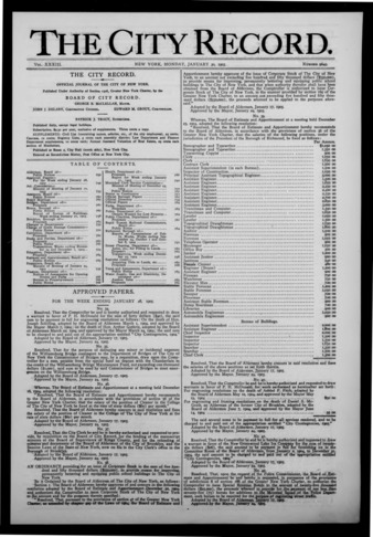 The City Record newspaper publishes notices which includes but is not limited to: public hearings and meetings, public auctions and sales, solicitations and awards and official rules proposed and adopted by city agencies. This is the City Record Newspaper for January 30, 1905.