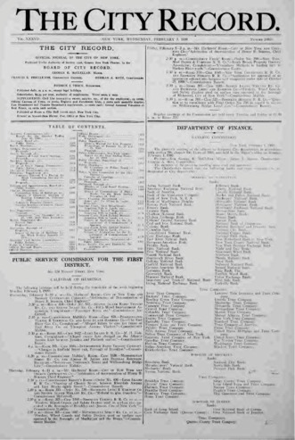 The City Record newspaper publishes notices which includes but is not limited to: public hearings and meetings, public auctions and sales, solicitations and awards and official rules proposed and adopted by city agencies. This is the City Record Newspaper for February 03, 1909.