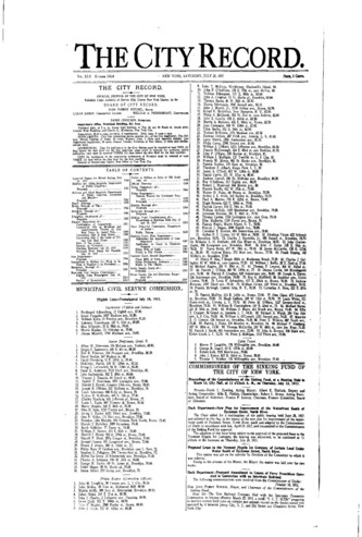 The City Record newspaper publishes notices which includes but is not limited to: public hearings and meetings, public auctions and sales, solicitations and awards and official rules proposed and adopted by city agencies. This is the City Record Newspaper for July 21, 1917.