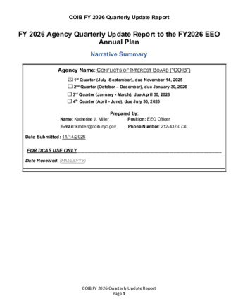 Fiscal Year 2026 Quarter 1 Report outlining the NYC Conflicts of Interest Board’s progress in implementing the goals of its annual Diversity and EEO Plan and participation in training classes to develop agency staff in the areas of equal employment, diversity, civil rights, inclusion, etc.