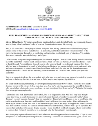 Mayor's Press Release: MAYOR DE BLASIO HOLDS MEDIA AVAILABILITY AT MT. SINAI UNITED CHRISTIAN CHURCH ON STATEN ISLAND