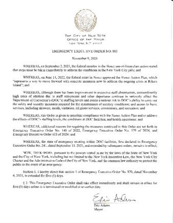 Emergency Executive Order No. 881, is being submitted to extend Emergency Executive Order No. 879, dated November 4, 2025; for five (5) days as it relates to Rikers.