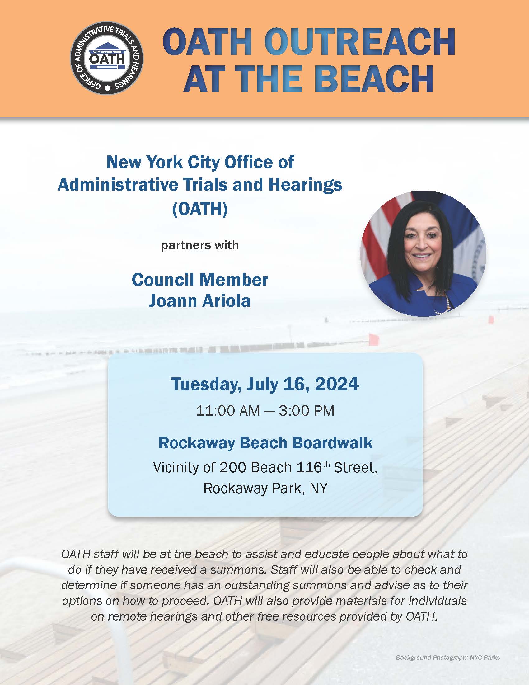 OATH staff were at the beach to assist and educate people about what to do should they have received a summons and to check to determine if someone has an outstanding summons. Materials about remote hearings and other free resources were provided to the public as well.
