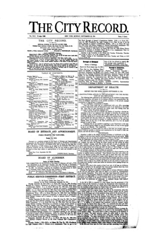 The City Record newspaper publishes notices which includes but is not limited to: public hearings and meetings, public auctions and sales, solicitations and awards and official rules proposed and adopted by city agencies. This is the City Record Newspaper for September 28, 1914.