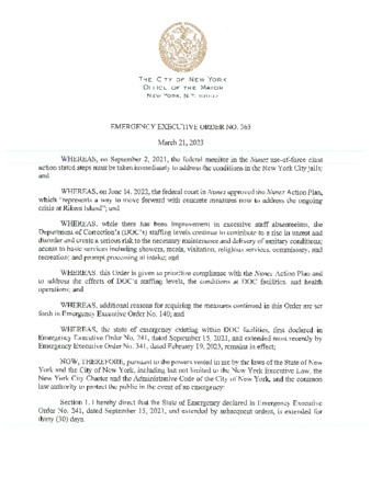 Emergency Executive Order No. 365, is being submitted to extend Emergency Executive Order No. 361, dated March 16, 2023, for five (5) days, if this relates to Rikers.
