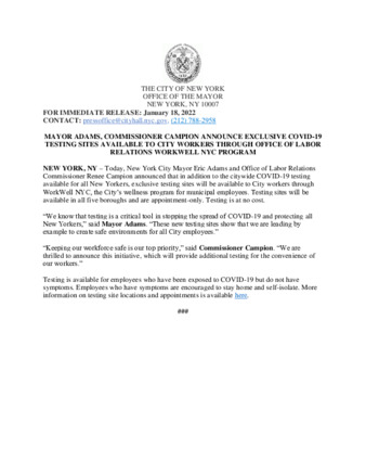MAYOR ADAMS, COMMISSIONER CAMPION ANNOUNCE COVID-19 TESTING SITES AVAILABLE TO CITY WORKERS THROUGH OFFICE OF LABOR RELATIONS WORKWELL NYC PROGRAM