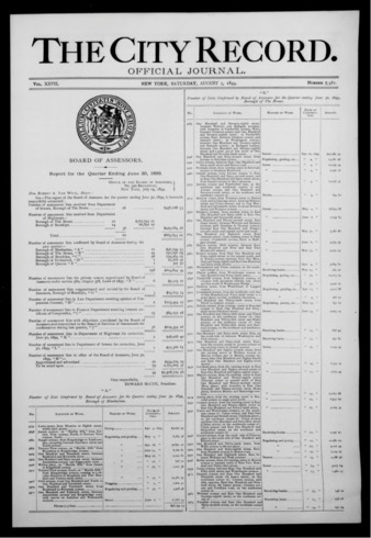 The City Record newspaper publishes notices which includes but is not limited to: public hearings and meetings, public auctions and sales, solicitations and awards and official rules proposed and adopted by city agencies. This is the City Record Newspaper for August 05, 1899.