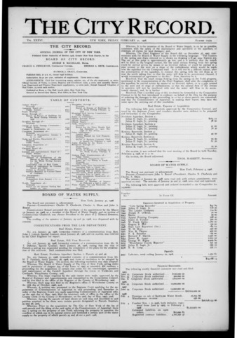 The City Record newspaper publishes notices which includes but is not limited to: public hearings and meetings, public auctions and sales, solicitations and awards and official rules proposed and adopted by city agencies. This is the City Record Newspaper for February 21, 1908.
