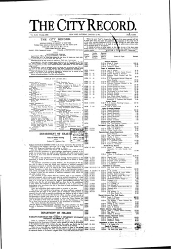 The City Record newspaper publishes notices which includes but is not limited to: public hearings and meetings, public auctions and sales, solicitations and awards and official rules proposed and adopted by city agencies. This is the City Record Newspaper for January 02, 1915.