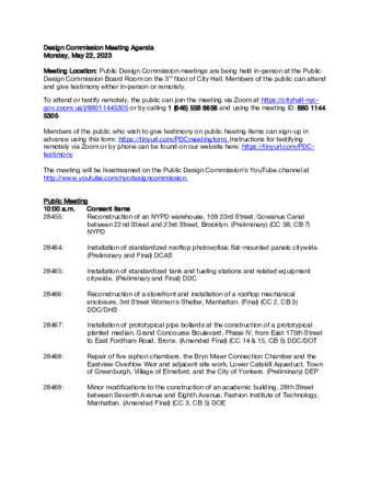 The Public Design Commission meets once a month. The meeting agendas are posted online three business days in advance of each meeting and published in the City Record. Agendas are also distributed to all City Council members, Community Boards, and City agency liaisons.