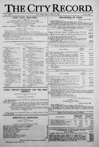 The City Record newspaper publishes notices which includes but is not limited to: public hearings and meetings, public auctions and sales, solicitations and awards and official rules proposed and adopted by city agencies. This is the City Record Newspaper for April 16, 1909.