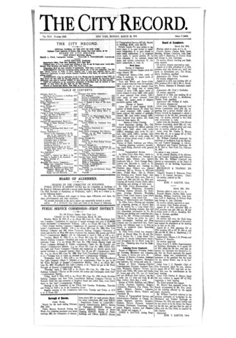 The City Record newspaper publishes notices which includes but is not limited to: public hearings and meetings, public auctions and sales, solicitations and awards and official rules proposed and adopted by city agencies. This is the City Record Newspaper for March 30, 1914.