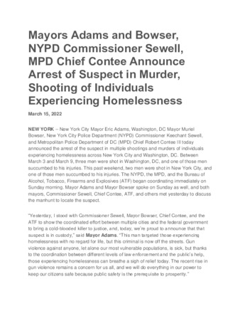 New York City Mayor Eric Adams, Washington, DC Mayor Muriel Bowser, New York City Police Department Commissioner Keechant Sewell, and Metropolitan Police Department of DC Chief Robert Contee III today announced the arrest of the suspect involved in targeting homelessness.
