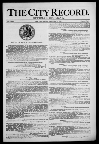 The City Record newspaper publishes notices which includes but is not limited to: public hearings and meetings, public auctions and sales, solicitations and awards and official rules proposed and adopted by city agencies. This is the City Record Newspaper for February 10, 1899.