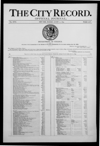 The City Record newspaper publishes notices which includes but is not limited to: public hearings and meetings, public auctions and sales, solicitations and awards and official rules proposed and adopted by city agencies. This is the City Record Newspaper for August 14, 1899.