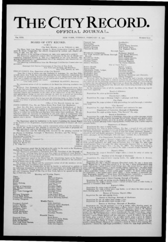 The City Record newspaper publishes notices which includes but is not limited to: public hearings and meetings, public auctions and sales, solicitations and awards and official rules proposed and adopted by city agencies. This is the City Record Newspaper for February 18, 1902.