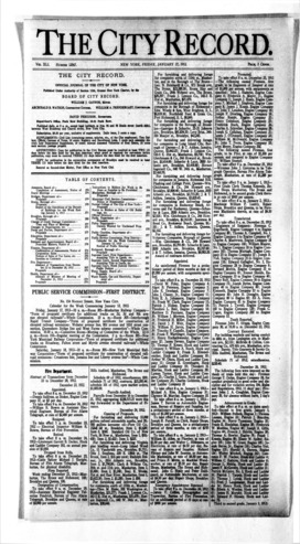 The City Record newspaper publishes notices which includes but is not limited to: public hearings and meetings, public auctions and sales, solicitations and awards and official rules proposed and adopted by city agencies. This is the City Record Newspaper for January 17, 1913.