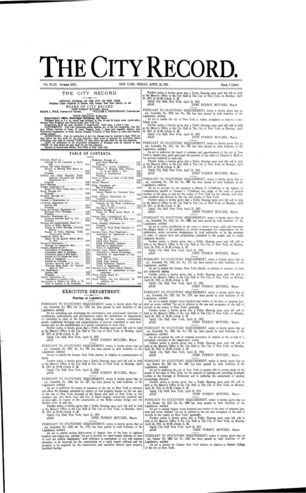 The City Record newspaper publishes notices which includes but is not limited to: public hearings and meetings, public auctions and sales, solicitations and awards and official rules proposed and adopted by city agencies. This is the City Record Newspaper for April 23, 1915.