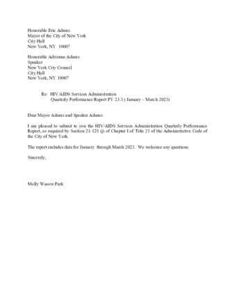 HIV/AIDS Services Administration (HASA) Quarterly Performance Report (FY 23.3 January—March 2023)