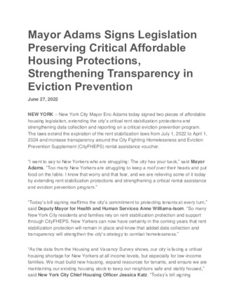 New York City Mayor Eric Adams signs two pieces of affordable housing legislation, extending the city’s critical rent stabilization protections and strengthening data collection and reporting on a critical eviction prevention program.