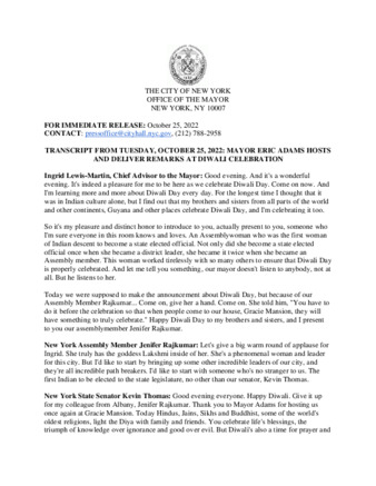 TRANSCRIPT FROM TUESDAY, OCTOBER 25, 2022: MAYOR ERIC ADAMS HOSTS AND DELIVER REMARKS AT DIWALI CELEBRATION