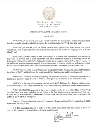 Emergency Executive Order No. 603, is being submitted to extend Emergency Executive Order No. 601, dated, June 3, 2024, for five (5) days, if this relates to Rikers.