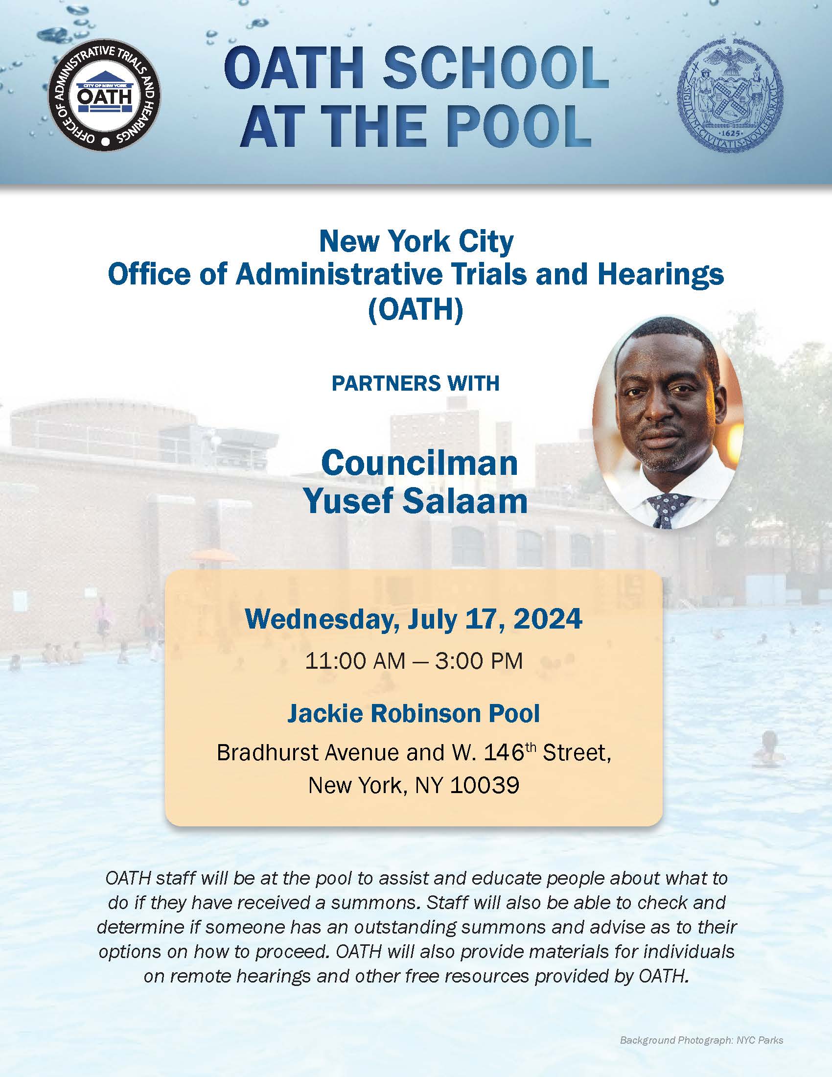 OATH staff were at the pool to assist and educate people about what to do should they have received a summons and to check to determine if someone has an outstanding summons. Materials about remote hearings and other free resources were provided to the public as well.