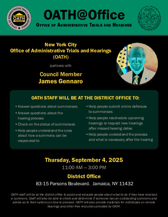 OATH staff were at the district office to assist and educate people about what to do should they have received a summons and to check to determine if someone has an outstanding summons. Materials about remote hearings and other free resources were provided to the public as well.