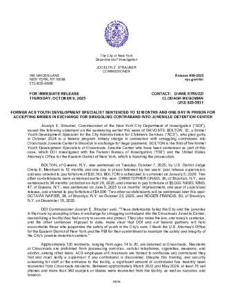 Jocelyn E. Strauber, Commissioner of the New York City Department of Investigation (“DOI”), issued the following statement on the sentencing earlier this week of DA’VONTE BOLTON, 32, a former Youth Development Specialist for the City Administration for Children’s Services (“ACS”), who pled guilty.