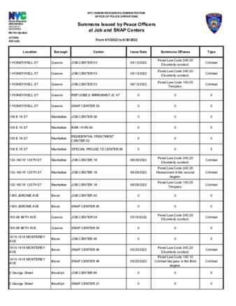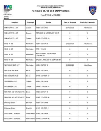- Quarterly Report on arrests, summonses, removals, escorts and use of force incidents in job centers and Supplemental Nutrition Assistance Program (SNAP) centers
