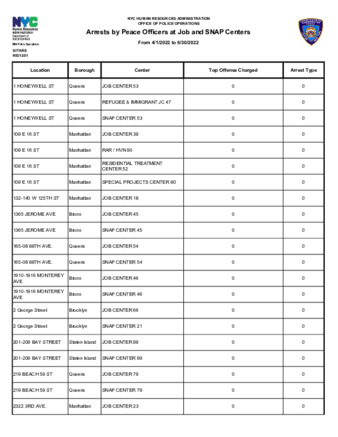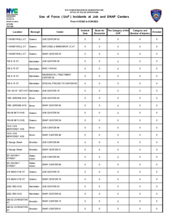 An aggregate report on arrests, summonses, removals, escorts and use of force incidents in job centers and SNAP centers of the Human Resources Administration/ Department of Social Services.