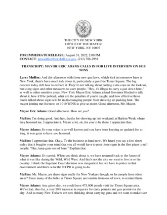 A transcript about New York City Mayor Eric Adams calling in for a live interview on 1010 WINS, addressing carrying firearms in restrictive areas and public awareness.