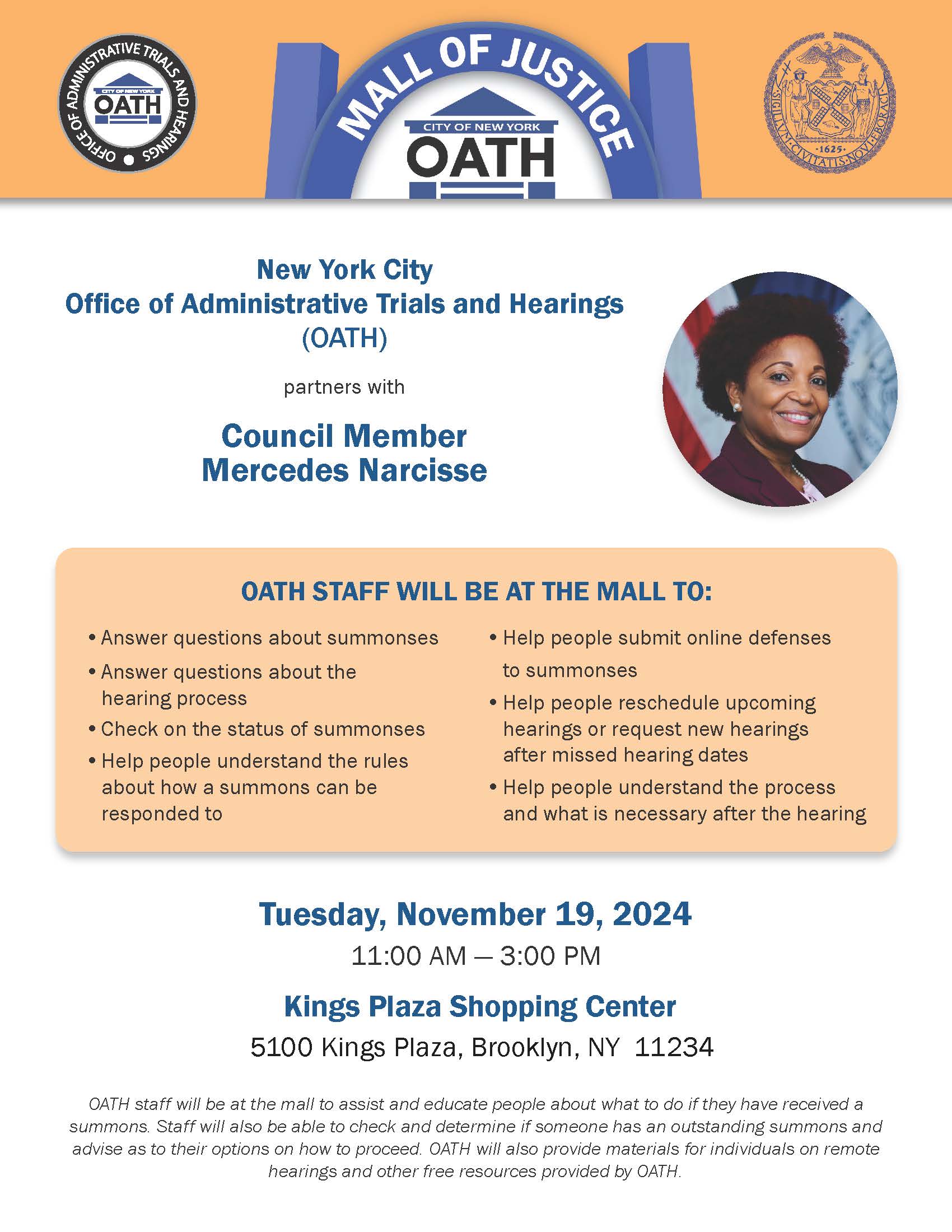 OATH staff were at the mall to assist and educate people about what to do should they have received a summons and to check to determine if someone has an outstanding summons. Materials about remote hearings and other free resources were provided to the public as well.